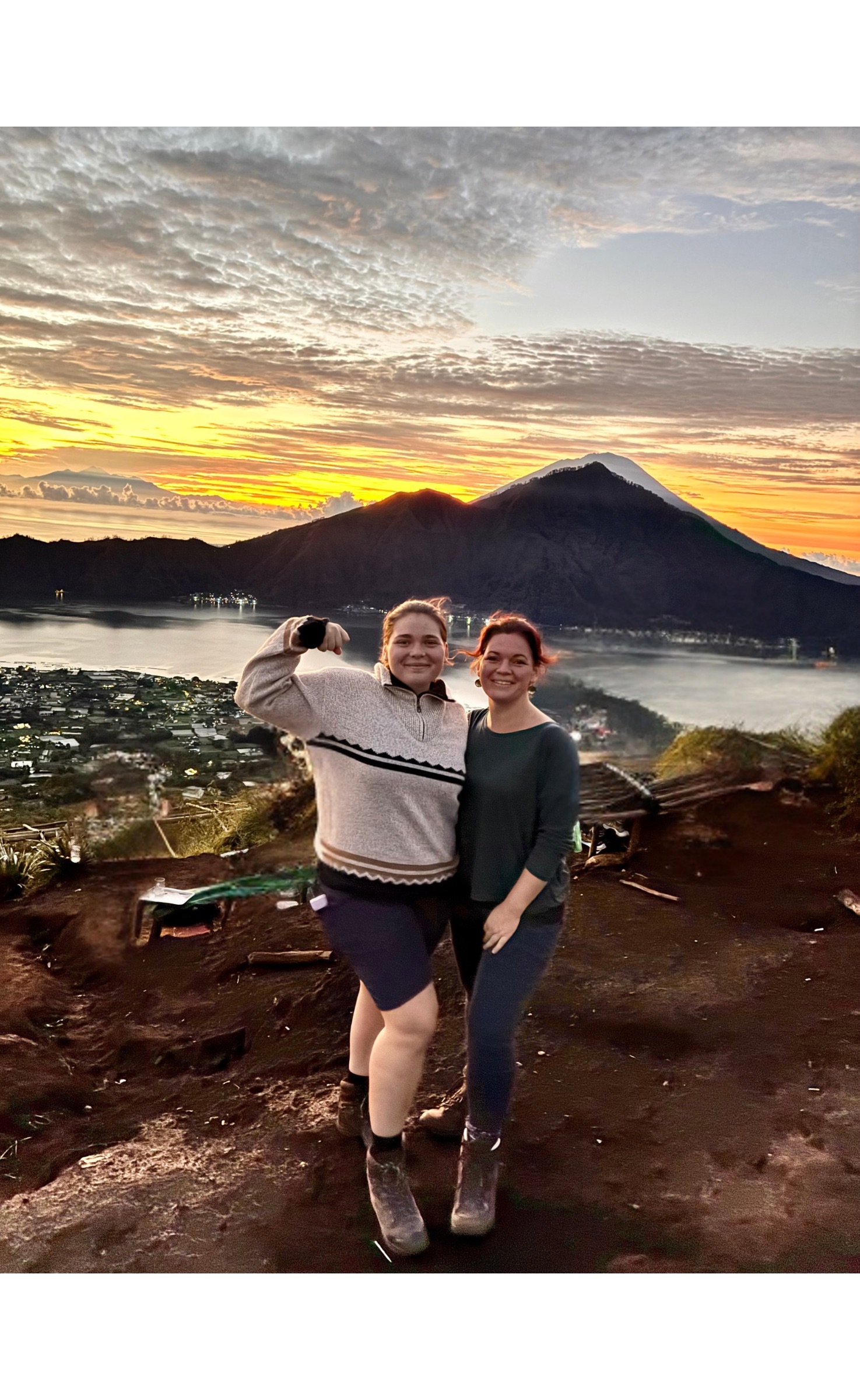 Auf dem Foto siehst du uns, wie wir zum Sonnenaufgang den Gipfel des Vulkans Mount Batur auf Bali erreicht haben (nach einer super anstrengenden Wanderung ab 2 Uhr morgens!)